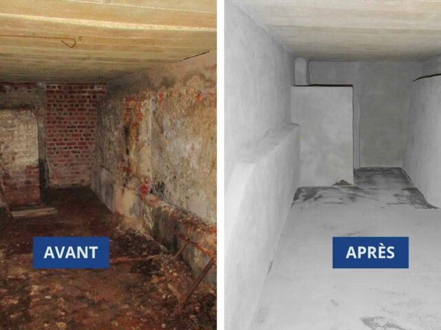 Assainissement d’une cave d’un château à Villers-la-Ville qui a accueilli une ancienne cuve à mazout. Pose du revêtement hydrofuge par gunitage et revêtement de sol étanche en fine épaisseur.