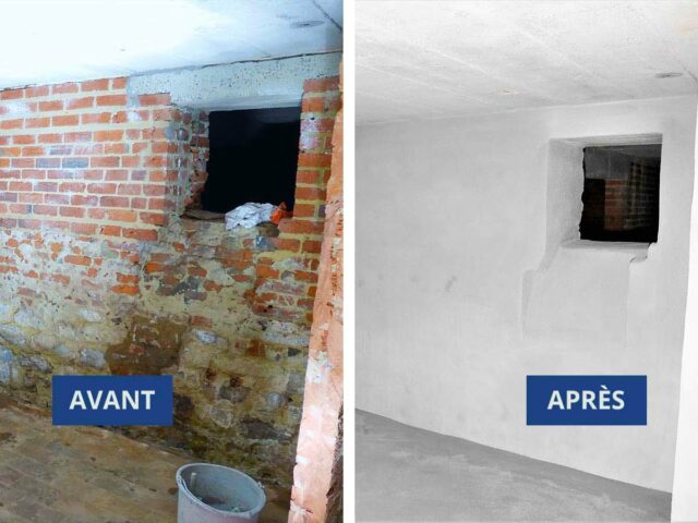 Assainissement d’un soupirail. Sablage à la scorie pour récupérer un support propre. Application du mortier Hydrofuge type Hydro+.