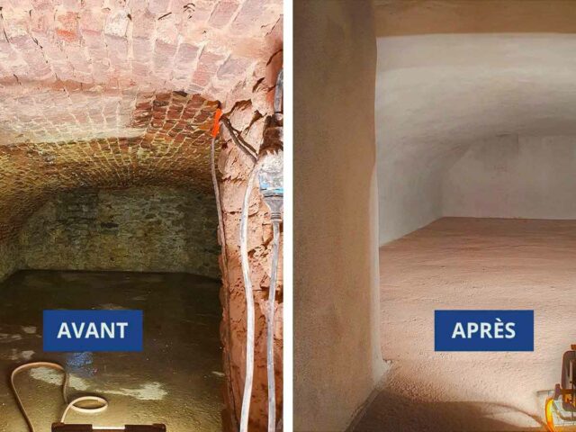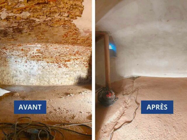 Assainissement d’une cave voûtée à Chastre dans le Brabant wallon. Décapage des anciens enduits et application de mortier hydrofuge Hydro+ par gunitage (projection de mortier).